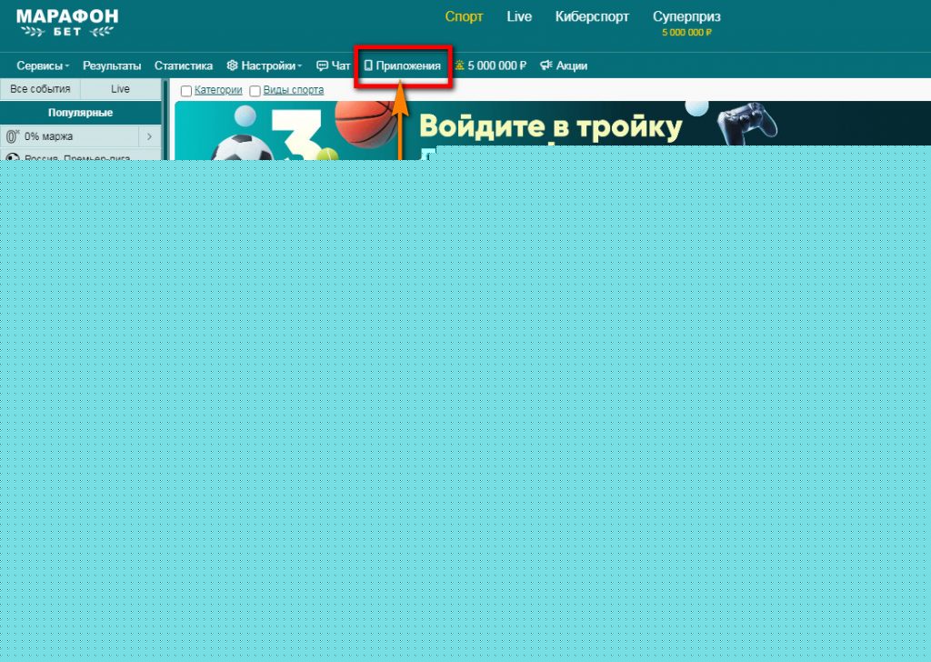 1. Зайдите на официальный сайт marathonbet.ru. Откройте раздел «Приложения».